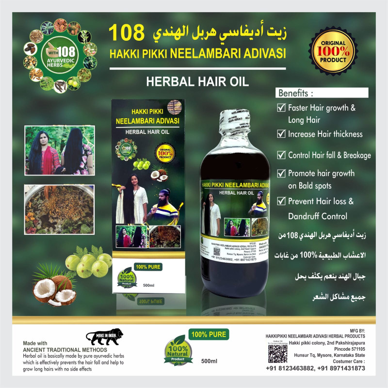 Transform your hair with Hakki Pikki Neelambari Adivasi Herbal Hair Oil, a premium formulation featuring 108 pure ayurvedic herbs. Made in India using ancient traditional methods, this 100% natural herbal oil effectively prevents hair fall and promotes long, healthy hair growth. The oil contains powerful ingredients including amla, coconut, hibiscus, neem, bhringraj, and curry leaves. Benefits include faster hair growth, increased hair thickness, control of hair fall and breakage, promotion of hair growth on bald spots, and prevention of hair loss with dandruff control. 500ml bottle, suitable for external use only.